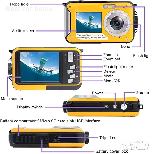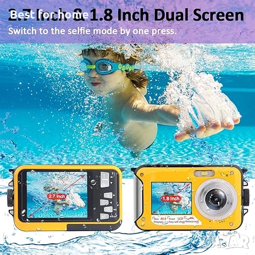 【Двоен екран, самоснимачка】С 1,8-инчов преден екран и 2,7-инчов заден екран, водоустойчивата цифрова камера ви позволява лесно да правите селфита, като натиснете бутона за превключване на екрана. Със самоснимачката 2/5/10 секунди никой няма да бъде пропуснат при групови снимки! Подводната камера поддържа micro SD карта с максимум 128G (която не е включена в комплекта).