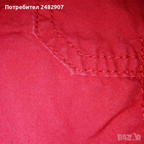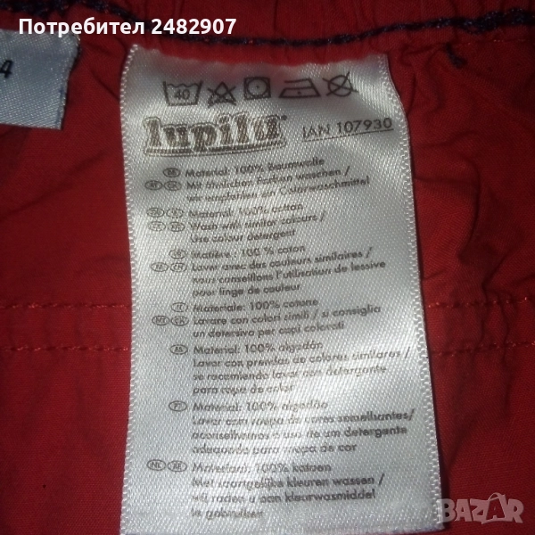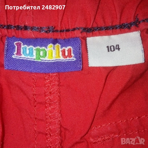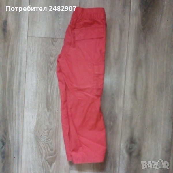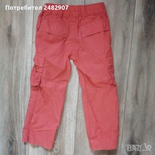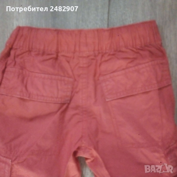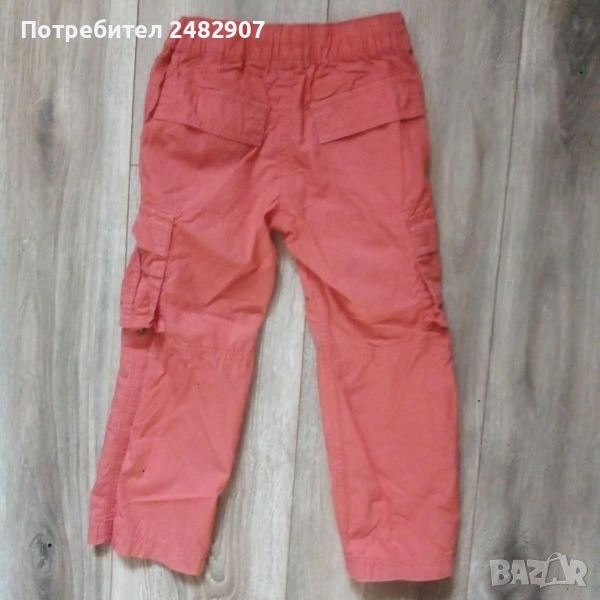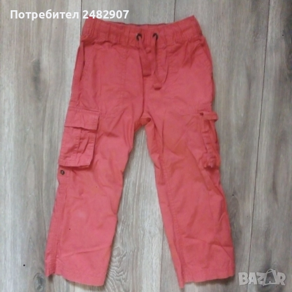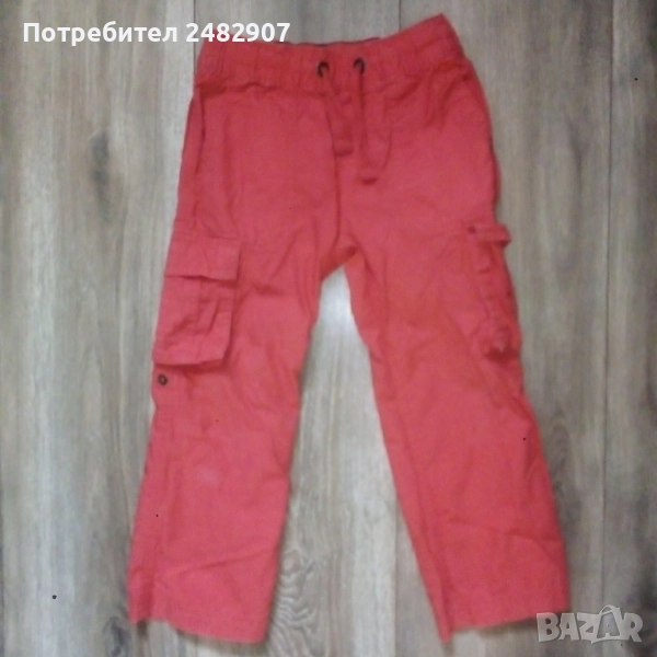 Детски летен панталон, цвят корал за ръст - 104 см. Съдържа 100 % памук. Ширина в талията - 24 см, дължина от талията до чатала - 17,5 см, дължина от талията до долу - 57 см, ширина на крачола в долната част - 15,5 см. Много запазен, почти не е използван, без забележки, с ластик и връзки в талията. Може да става и на къс.