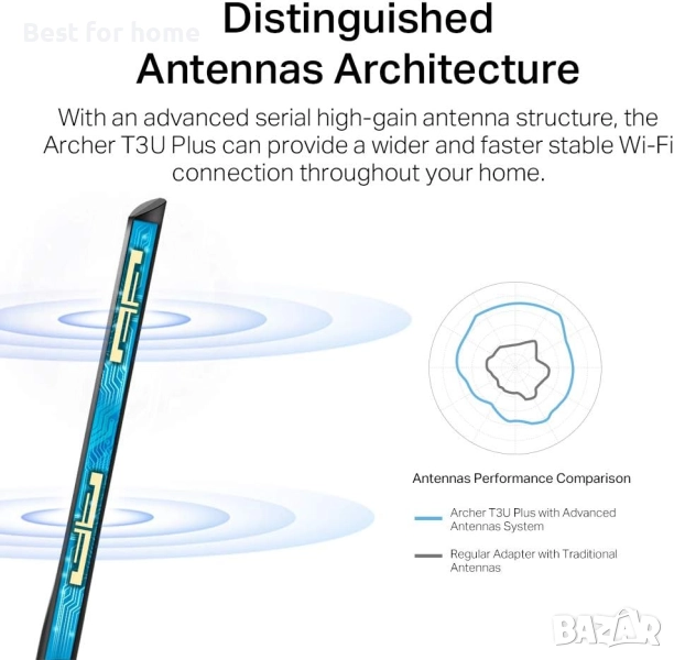 Външна антена Wi-Fi адаптер — Усъвършенстваните външни антени с висок коефициент на усилване значително подобряват силата на приема и предаване на сигнала на USB адаптера