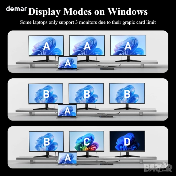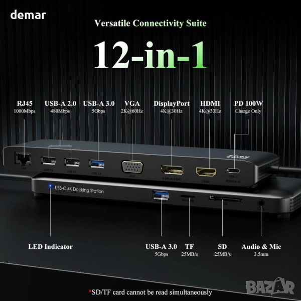 Тази 12-в-1 докинг станция трансформира вашето USB-C устройство в пълноценна работна станция с множество опции за дисплей чрез HDMI, DisplayPort и VGA, поддържайки до три екрана. Тя осигурява 85W захранване за бързо зареждане на лаптоп, като същевременно позволява едновременно зареждане на устройството и пренос на данни през високоскоростни USB портове. Gigabit Ethernet портът осигурява стабилна кабелна връзка, а двата слота за SD и microSD карти осигуряват бърз достъп за пренос на медийни файлове. Съвместима с Windows, macOS, Chrome OS, Linux и други, тя съчетава гъвкавост, производителност и екологичен, пестящ място дизайн, идеален както за професионални, така и за лични конфигурации.