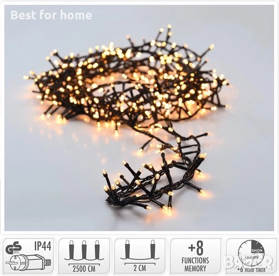 Коледни клъстерни лампички с функция таймер. Тези клъстерни лампички са идеалното решение за заплитане на коледните ви лампички! С 1250 светодиода, тези клъстерни лампички осигуряват изключително топла бяла светлина, идеална както за закрито, така и за открито. Лампичките имат черен кабел, навиват се на удобна макара и са с дължина 2500 см. Тези клъстерни лампички за елха имат кабел с дължина 300 см и са със степен на защита IP44. Предлагат се с 8-функционален контролер с памет. Коледни лампички, феерични лампички, феерични лампички, гирлянди и змийски лампички.