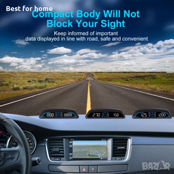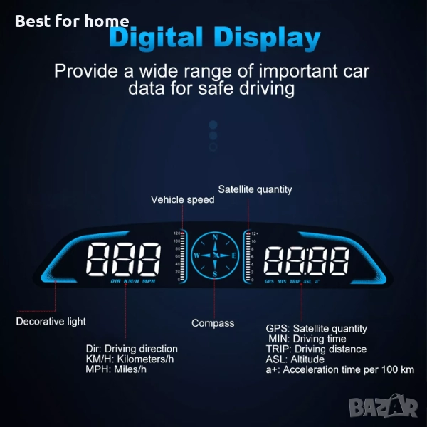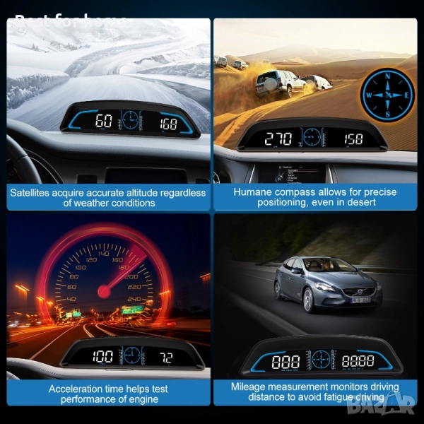 GPS HUD: Това устройство показва всички важни данни на HD LED дисплей, разположен в съответствие с пътя. Минимизира риска от откъсване на поглед от пътя по време на шофиране за максимална безопасност. Оборудван с GPS и Beidou двоен чип режим, той е в състояние да предостави широк набор от важни данни за автомобила, включително скорост на шофиране (км/ч или мили в час), посока на шофиране, надморска височина, пробег, количество спътници, време на шофиране, време на ускорение на 100 км и реално време плавно и точно без забавяне.