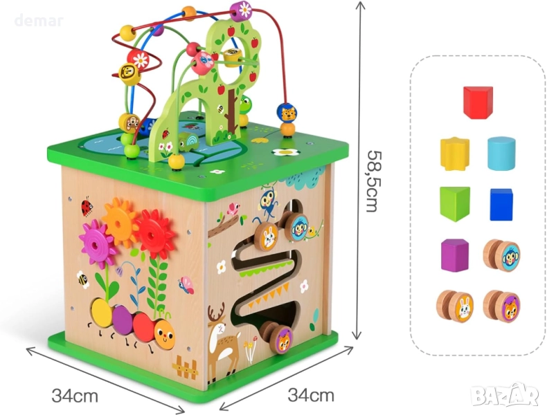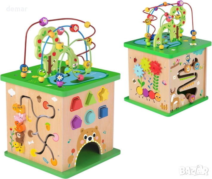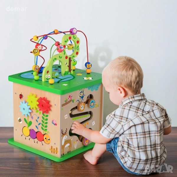 Този дървен куб за активност предлага пет ангажиращи страни, включително приключенска земя с мъниста, сортировач на форми, стойка за опашка, въртяща се плоча и игра с потупване, предназначени да забавляват малките деца, докато учат. Той помага за развитието на двигателните и логическите умения, насърчава постоянството и подкрепя въображаемата игра с приятелски настроени животински герои. Изработен от 100% естествена борова дървесина и боядисан с нетоксични цветове, той се отличава с гладки, заоблени ръбове и солидна изработка, осигурявайки безопасно и издръжливо игрово изживяване за малки деца.