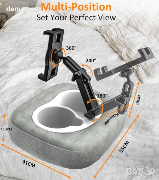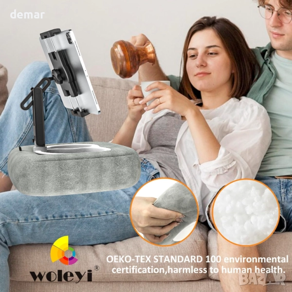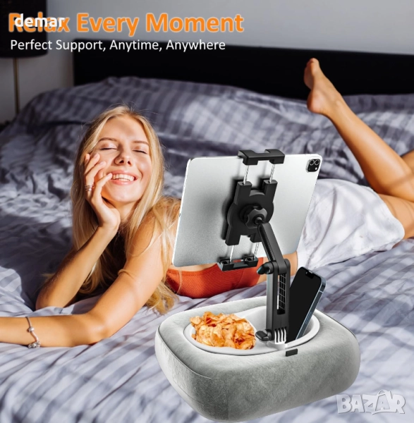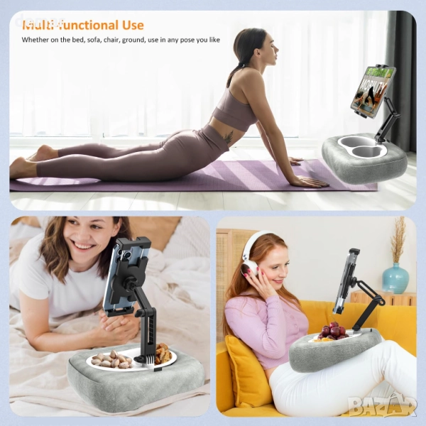Тази лека и преносима поставка за таблет предлага удобно използване без ръце на таблети или телефони на леглото, дивана, в скута, на стола или дори в колата. Изработена от мека, нежна за кожата плюшена материя, пълна с дебела гъба, тя осигурява усещане за облак и разполага с подвижни копчета за лесно почистване. Регулируемият дизайн позволява множество ъгли на гледане, осигурявайки ергономичен комфорт, независимо дали сте седнали или легнали, като същевременно намалява напрежението във врата и ръцете. Съвместима с широка гама от устройства от 4" до 13", тя поддържа повечето таблети и смартфони със или без калъфи.
