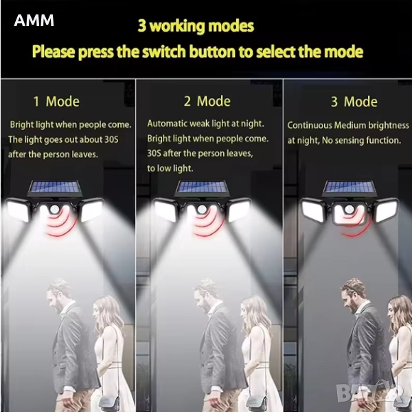 Режим 3 - засичане на движение - макс. осветеност за 15-25 сек. - без засичане на движение светлината се изключва.
