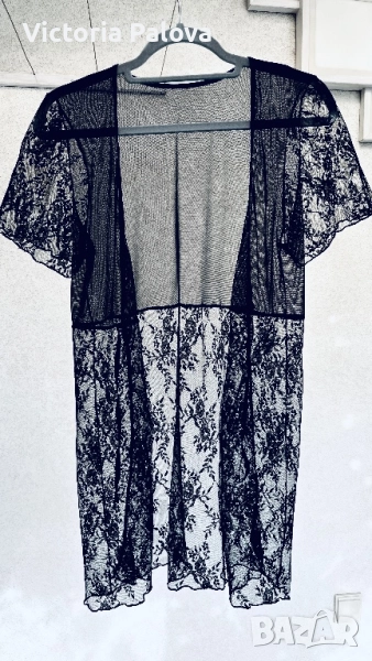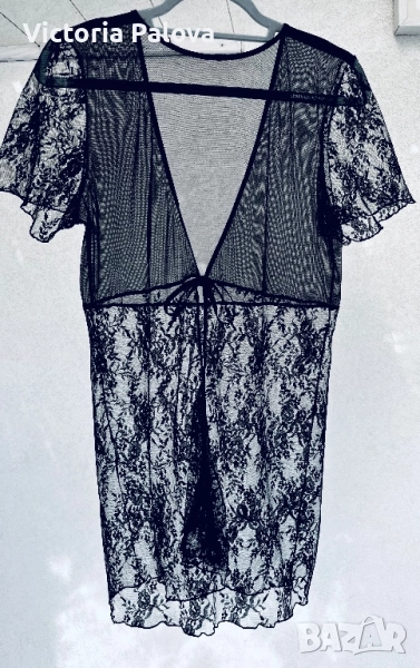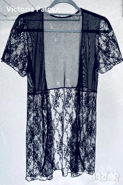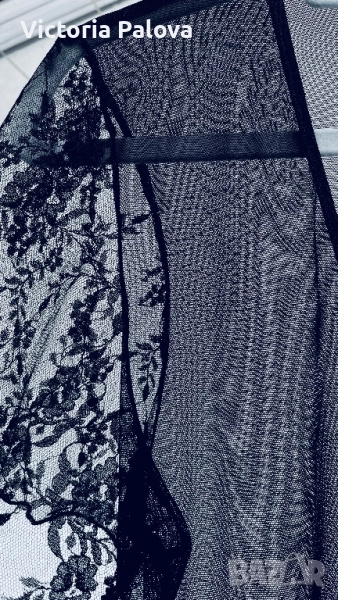 Елегантна черна нощница, съчетаваща нежност и изкусителност, перфектна за романтични вечери, изработена от лека дишаща мрежа и фина дантела по ръкави и в долната част - с цветни мотиви от листа и цветя, които добавят викториански чар. Женствено V деколте, меки и гъвкави ластични връзки , които се регулират лесно, без да стягат. Тази нощница не е просто за сън , тя е за настроение, елегантност и красота. Рамо - 40см, ГО - 46см, дължина - 79см.