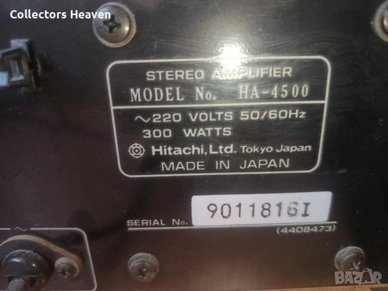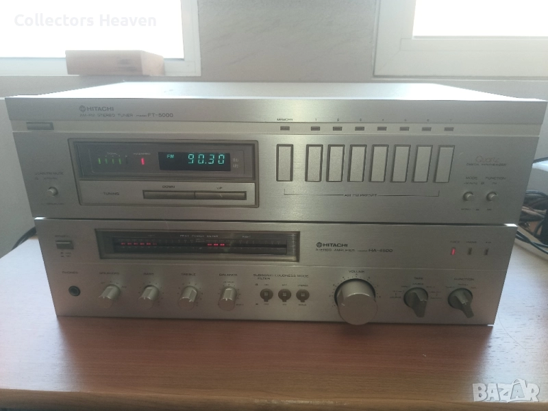 Hitachi HA 4500 Изходна мощност: 43 вата на канал при 8 Ω (стерео) Честотен диапазон: 10 Hz до 40 kHz Общо хармонично изкривяване: 0,05% Входна чувствителност: 2,5 mV (MM), 150 mV (DIN), 150 mV (линия) Съотношение сигнал/шум: 75 dB (MM), 90 dB (DIN), 88 dB (линия) Изход: 150 mV (линия), 40 mV (DIN) Импеданс на натоварване на високоговорителя: 4 Ω до 16 Ω Управление: Бас, Високи честоти, Силна сила и Филтър за ниски честоти Захранването с променлив ток зависи от страната на получаване. Нетно тегло (2,2 lb = 1 kg) 7,3 kg / 16 lb 1,3 oz (16,079 lb) Hitachi FT 5000 тип FM/AM цифров синтезатор тунер Секция на FM тунера честота на приемане 76.1 MHz до 89.9 MHz практическа чувствителност 1.9 μ V (300 ω, ihf) 10.8 dbf (нов ihf) съотношение сигнал/шум 50 dB чувствителност моно: 16.2 dBf стерео: 38.2 dBf Ефективна селективност (IHF) 75 dB съотношение сигнал/шум моно: 72 dB стерео: 68 dB Коефициент на изкривяване моно: 0.12% стерео: 0.2% Разделяне (1 kHz) 45 dB Честотна характеристика 20 Hz до 15 kHz ± 1 dB Честота на приемане 531 kHz до 1602 kHz практическа чувствителност 300 μ F/m съотношение сигнал/шум 50 dB Скорост на деформация (400Hz) 0,7% Консумирана мощност 12W Външни размери Ширина 435x Височина 105x Дълбочина 273 мм Тегло 4,4 кг