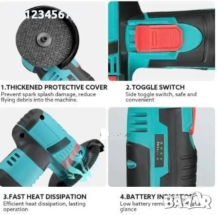 Мини Акумулаторен безчетков ъглошлайф с 2 диска в комплекта, с диаметър 76 мм/ за метал, дърво и шлайфане /. Идеален за рязане и шлайфане на дърво, метал, пластмаса и други материали. Има ергономична ръкохватка. Разполага със светодиод на дръжката с който показва нивото на заряд на батерията. Машината е лека, компактна и удобна за работа и с една ръка.
