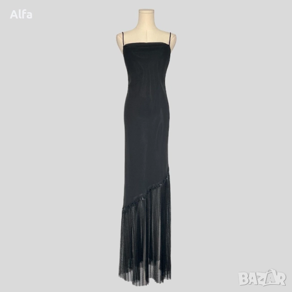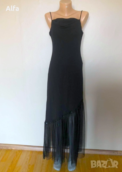 Прекрасна дълга, черна рокля с дантела в долният край. Размер по етикет 9-10 (UK), тоест отговаря на размер М/L. Гръдна от 42см до 45см. Не прозира и няма забележки.