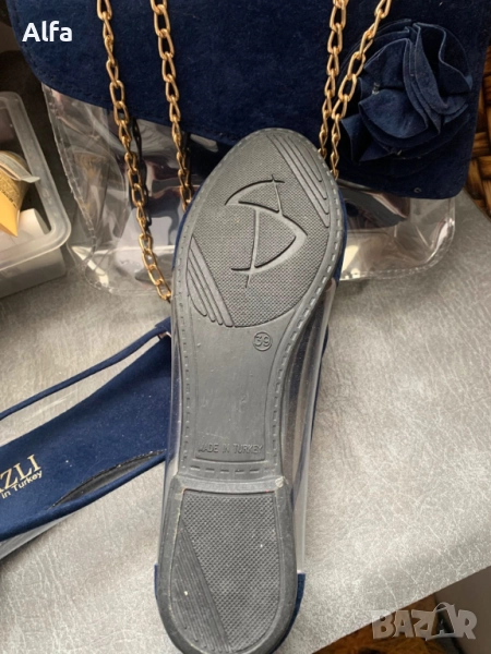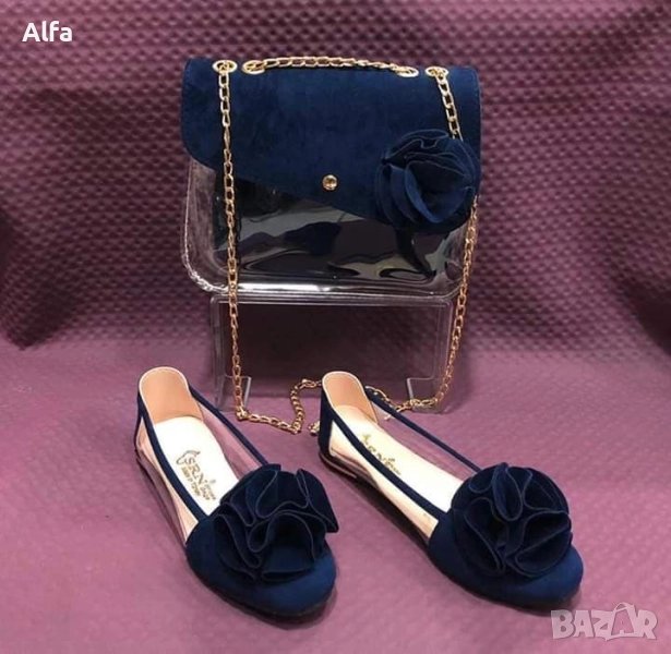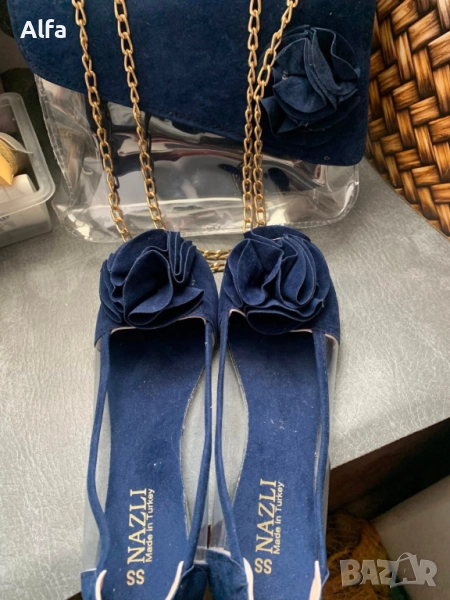 Уникален сет от обувки, тип балеринки и чанта в кралско синьо. Балеринките са номер 39 - отговарят си на номерчето, има снимка в стелката в см. Чантата има прозрачна и непрозрачна част. Нови са и се вижда по подметката, но понеже не пазя кутии ги слагам в графа "използвани".