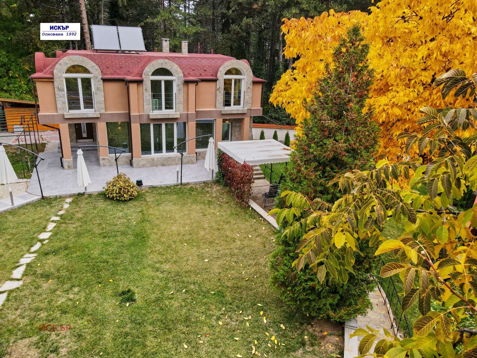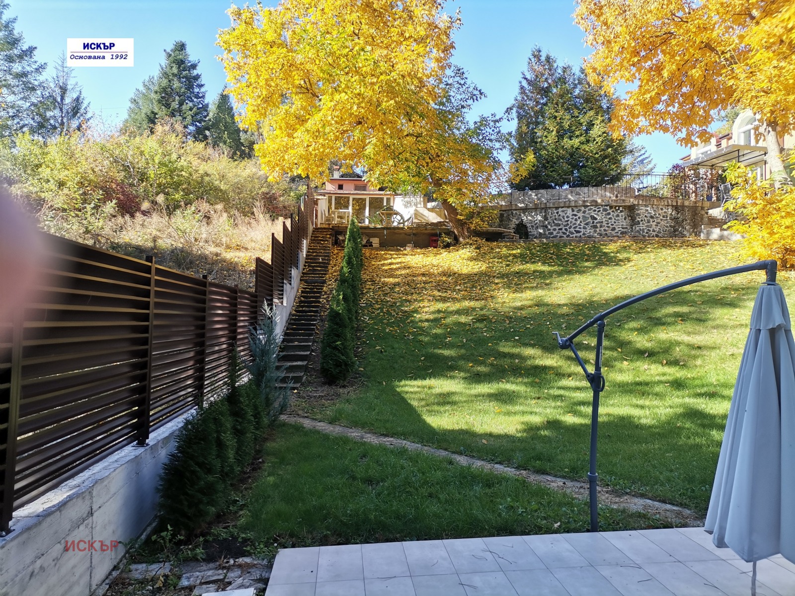 Пътеки и площадки: 270 кв.м, облицовани с естествен камък и италиански гранитогрес