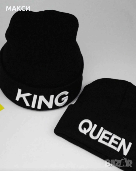 Топла силно еластична шапка унисекс с бяла бродерия надпис "Кралица" и "Крал" в наситено черно, снимка 1 - Шапки - 52268854 1/1