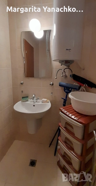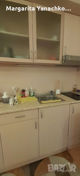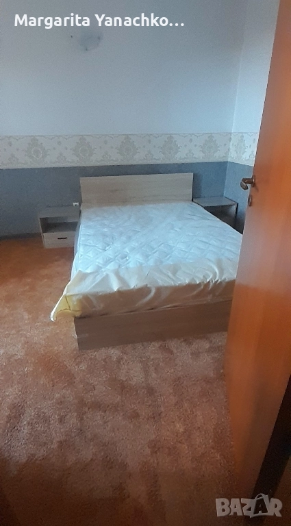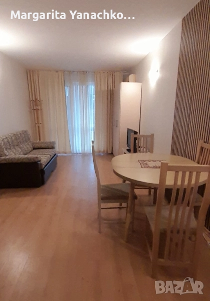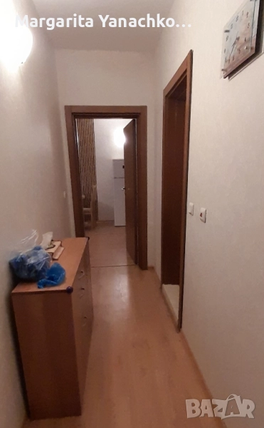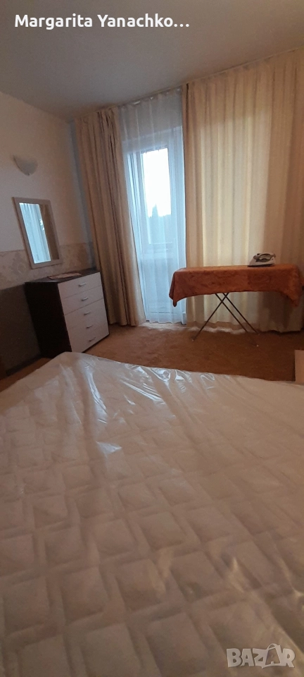 Двустаен апартамент,65 кв.м с южно изложение ( непреходен,партерен) състоящ се от коридор, спалня( 13 кв.м) и дневна 34 кв.м. Банята с работещ 50 л.бойлер,душ кабина и аксесоари, се намира м/у хола и спалнята, което осигурява спокойствие на нощуващите. Спалнята,обзаведена с нови мебели, е свързана с малка тераса,оградена с ПВЦ, която може да се ползва и за килер и за детски кът. В хола има изградена кухня( 3,10 м дължина) оборудвана с всичко необходимо-съдомиялна, пералня, 2 хладилника, микровълнова печка, 2 индукционни котлона,абсорбатор и др. Всички уреди са в изправност. Кът за хранене и кът за отдих с диван-спалня.