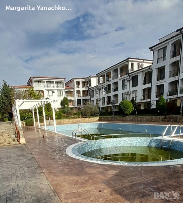 Подът в хола и коридора е ламинат,в спалнята мокет . Стаите са защитени с вътрешни щори,плътни и ефирни завеси.Апартаментът е готов за нанасяне и не се нуждае от допълнителни инвестиции. От хола се излиза на тераска оградена от зеленина и с достъп до басейна на комплекса и изглед към морето.Отоплението е на климатик. Южният плаж е на 400 м. Има паркинг, районът е тих, няма трафик,затворена улица.