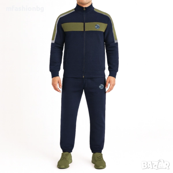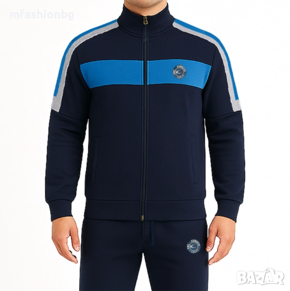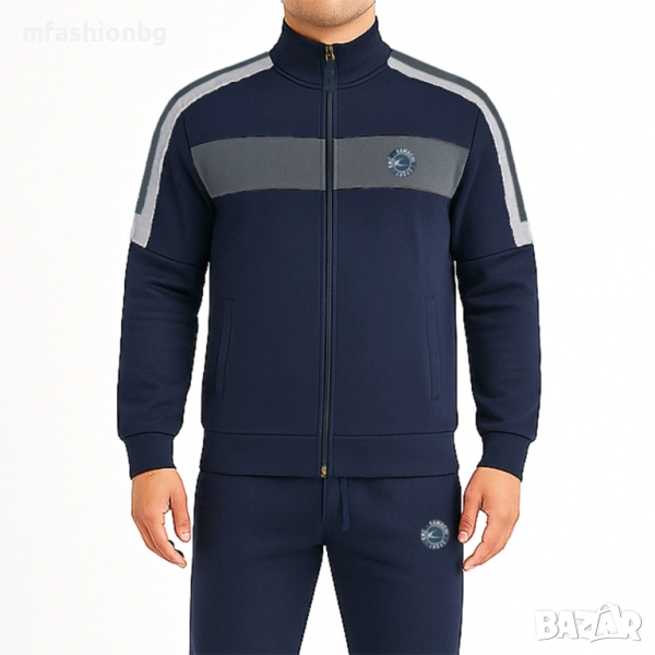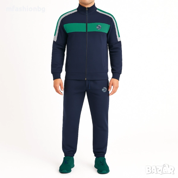 Горнището е с изчистен дизайн, висока яка и контрастни акценти на гърдите.