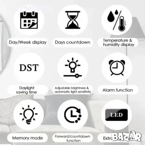 * Показване едновременно на дисплея: температура, влажност, час, седмица, дата .