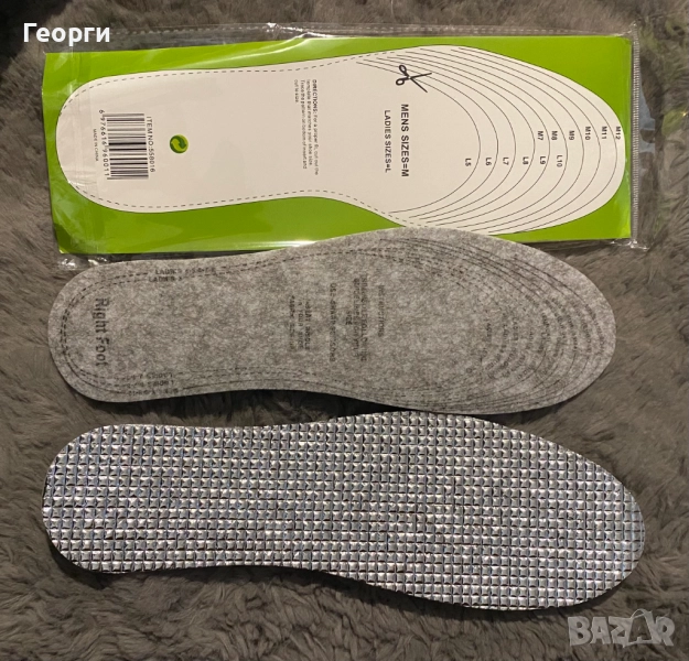 1). Филцови стелки с термо защита с меко еластично алуминиево фолио от долу. Стелките са в един размер, просто ги срежете според нужния размер. В опаковка има картон, препоръчвам да се "потренирате" върху него за да знаете точно колко големи стелки ще Ви трябват. :)
