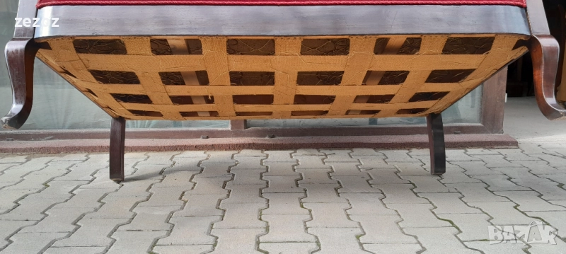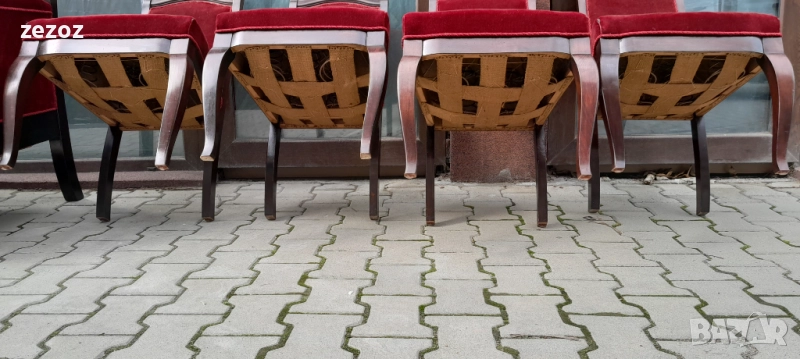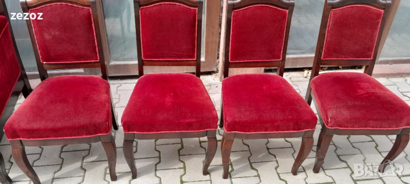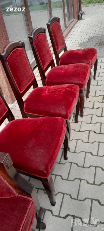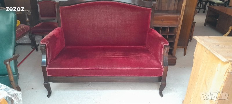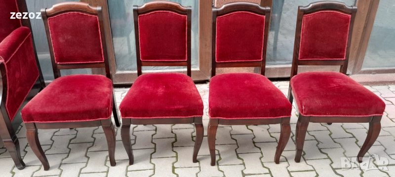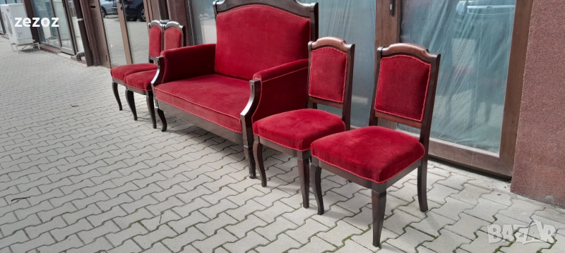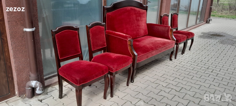 Цената е за комплект.Ретко комплект-канапе двойка и четири стола.Конструкция масив.С височината до седалките,комплекта е подходящ за трапезна маса.Старата технология на седалките-ремъци и пружини,които са в перфектно състояние.Комплекта е конструктивно здрав,но си има нормални износвания по плюшената дамаска от годините,но няма скъсано.Размери-