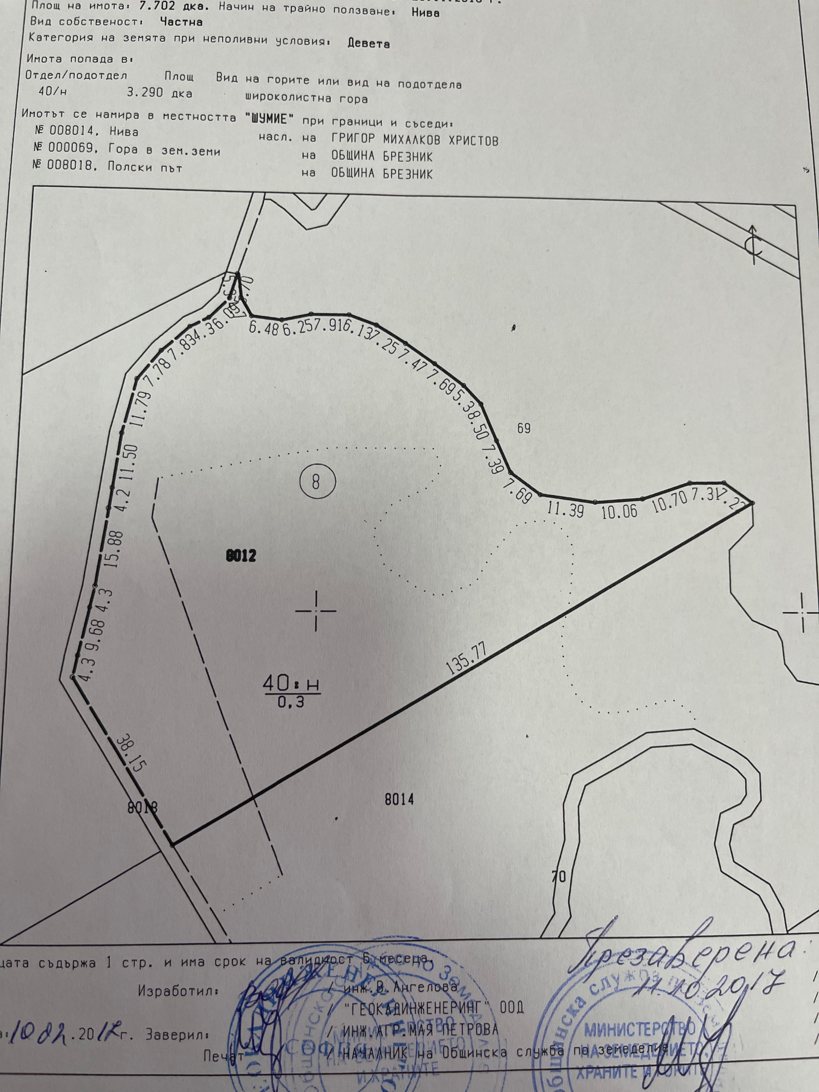Поземлен имот с номер 008012 (земеделска земя)с площ от 7.702 дка,от които 3.290 дка широколисна гора, находящ се в землището на с. Завала, община Брезник. Начин на трайно ползване: НИВА. Категория на земята: 9-та.
