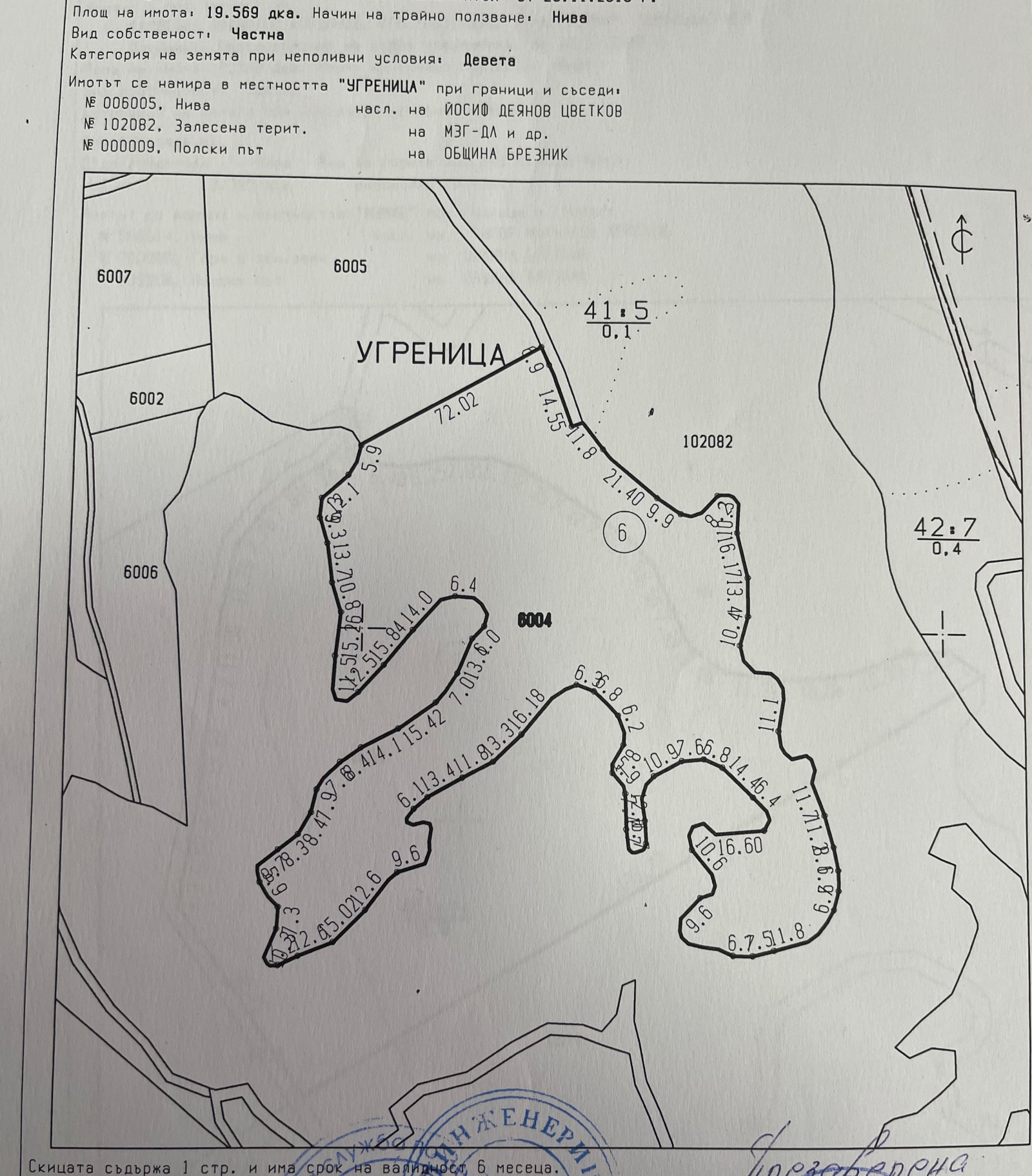 Поземлен имот с номер 006004 (земеделска земя) с площ от 19.569 дка, находящ се в землището на с. Завала, община Брезник. Начин на трайно ползване: НИВА. Категория на земята: 9-та. Подходящи за земеделие или гледане на животни. До къщи. Достъп до ток и вода.