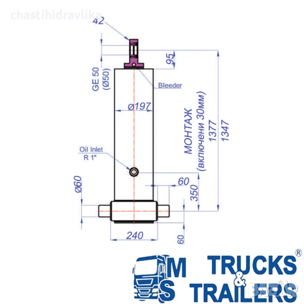 За монтирането на този Хидравличен цилиндър са необходими допълнителни елементи - горна стойка (47000026) и долен комплект стойки (47000017), които се заплащат отделно.