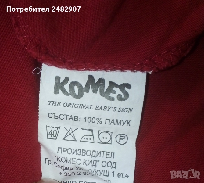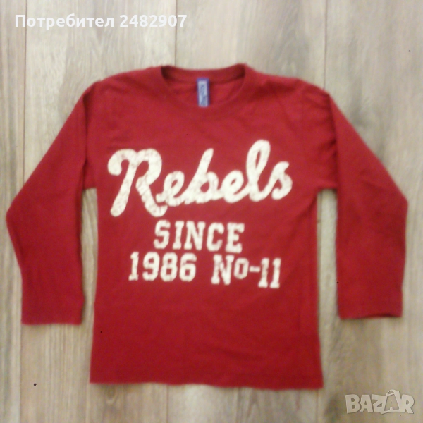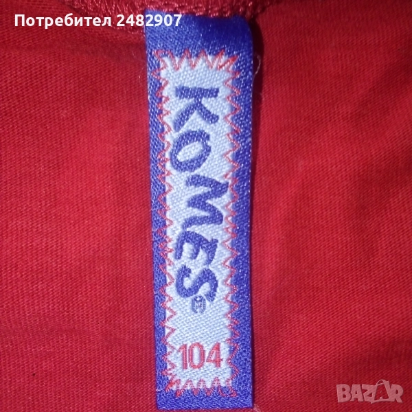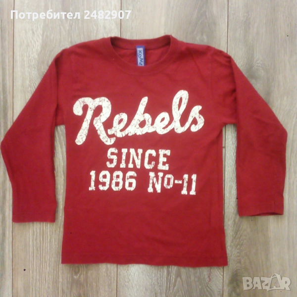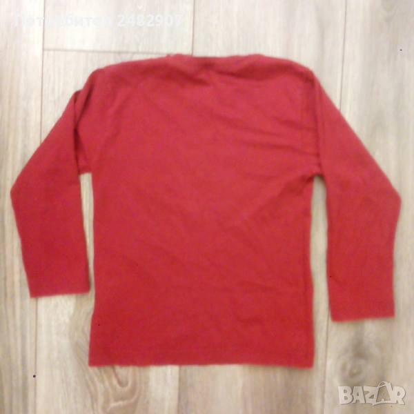 Червена детска блуза с щампа за ръст - 104 см. Съдържа 100 % памук. Ширина в раменете - 27 см, ширина под мишниците - 31 см, ширина в долната част - 31 см, дължина от рамото до долу - 42 см, дължина на ръкава от рамото - 33 см, ширина на ръкава в долната част - 8,5 см. Много запазена, почти не е използвана, без забележки.