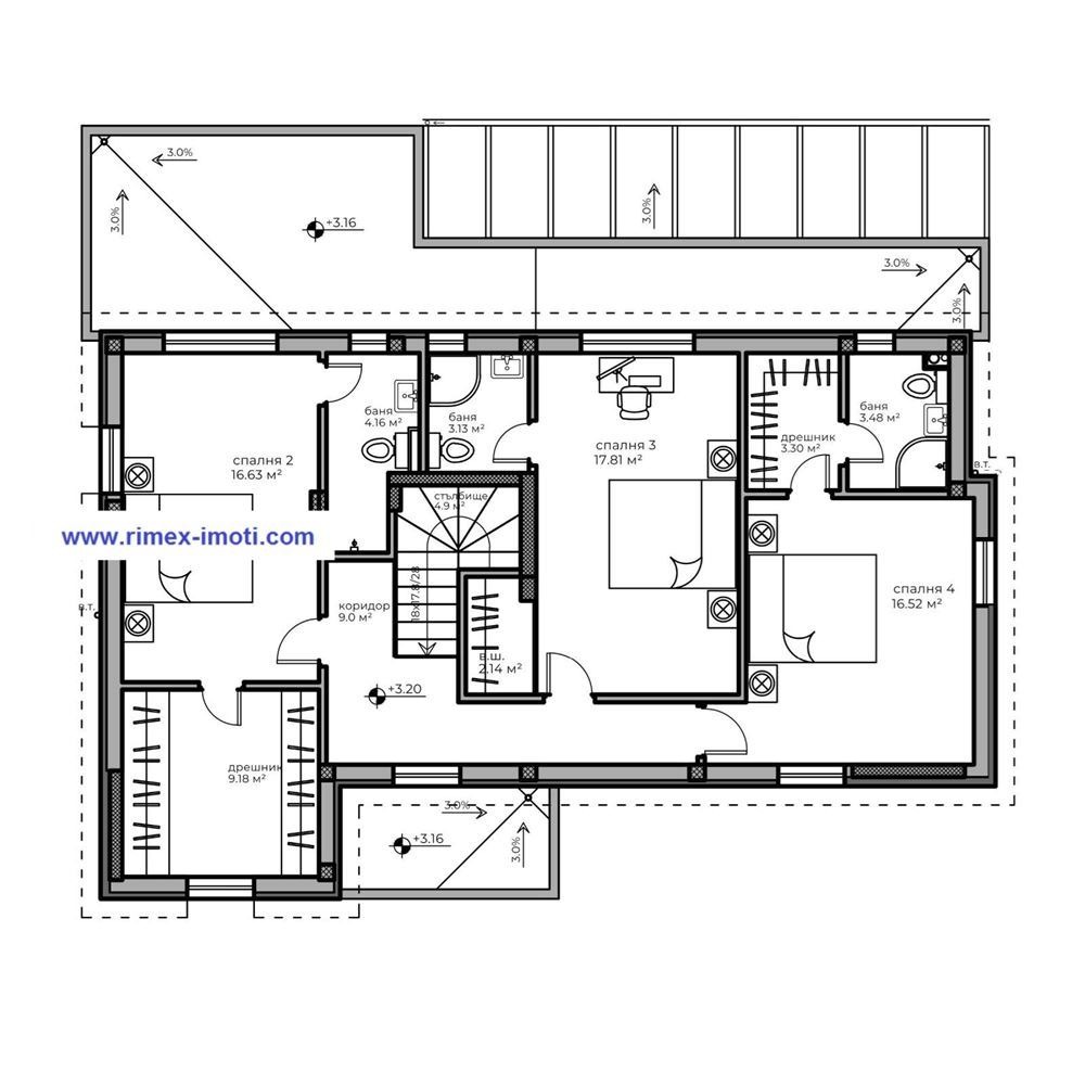 4 спални, от които 3 със собствени бани и дрешници
