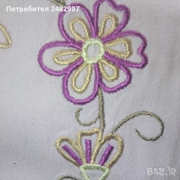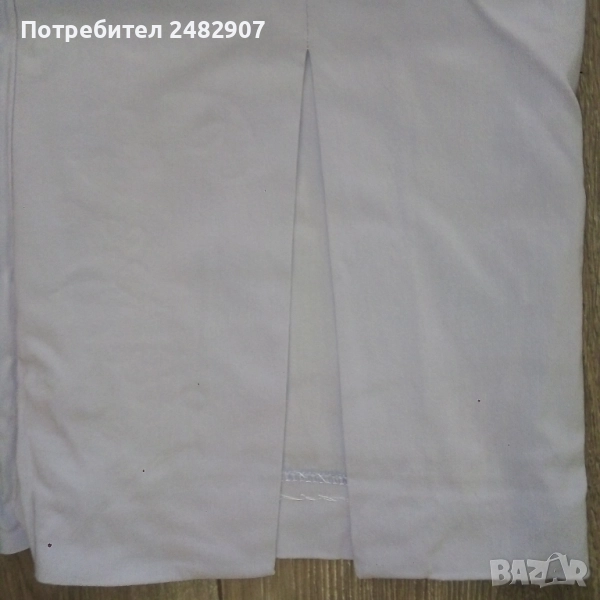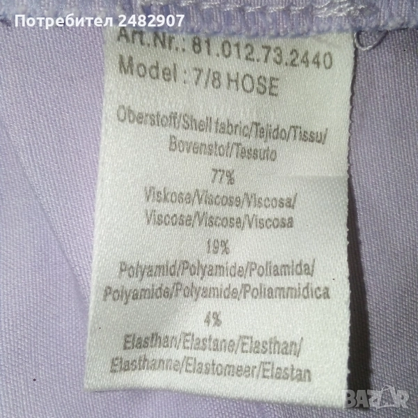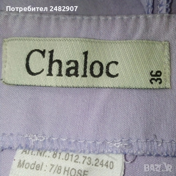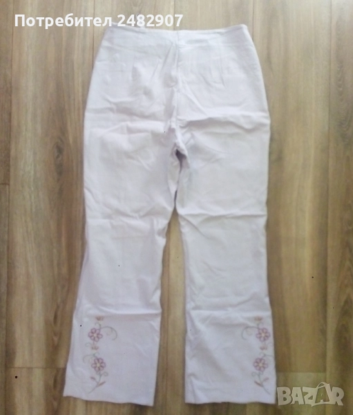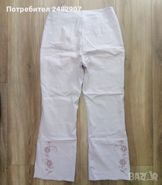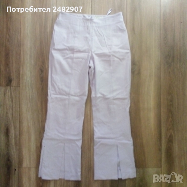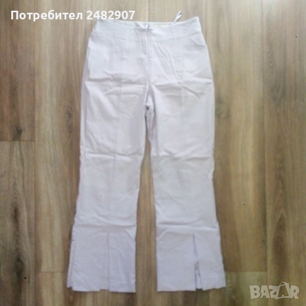 Дамски 7/8 панталон в бледо лилав цвят с цепки на крачолите отпред и бродерия отзад, размер 36. Съдържа 77 % вискоза, 19 % полиамид и 4 % еластан. Ширина в талията - 36 см, дължина от талията до чатала - 25,5 см, дължина от талията до долу - 91 см, ширина на крачола в долната част - 23 см, дължина на цепките - 19 см. Много запазен, почти не е използван, без забележки, закопчаване - със скрит английски цип отпред.