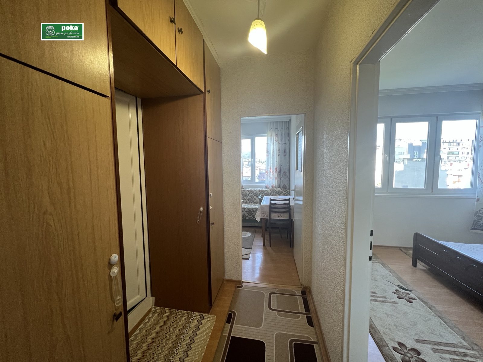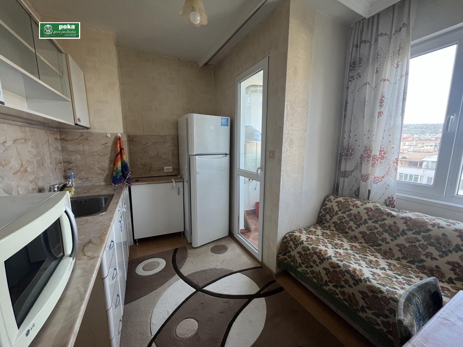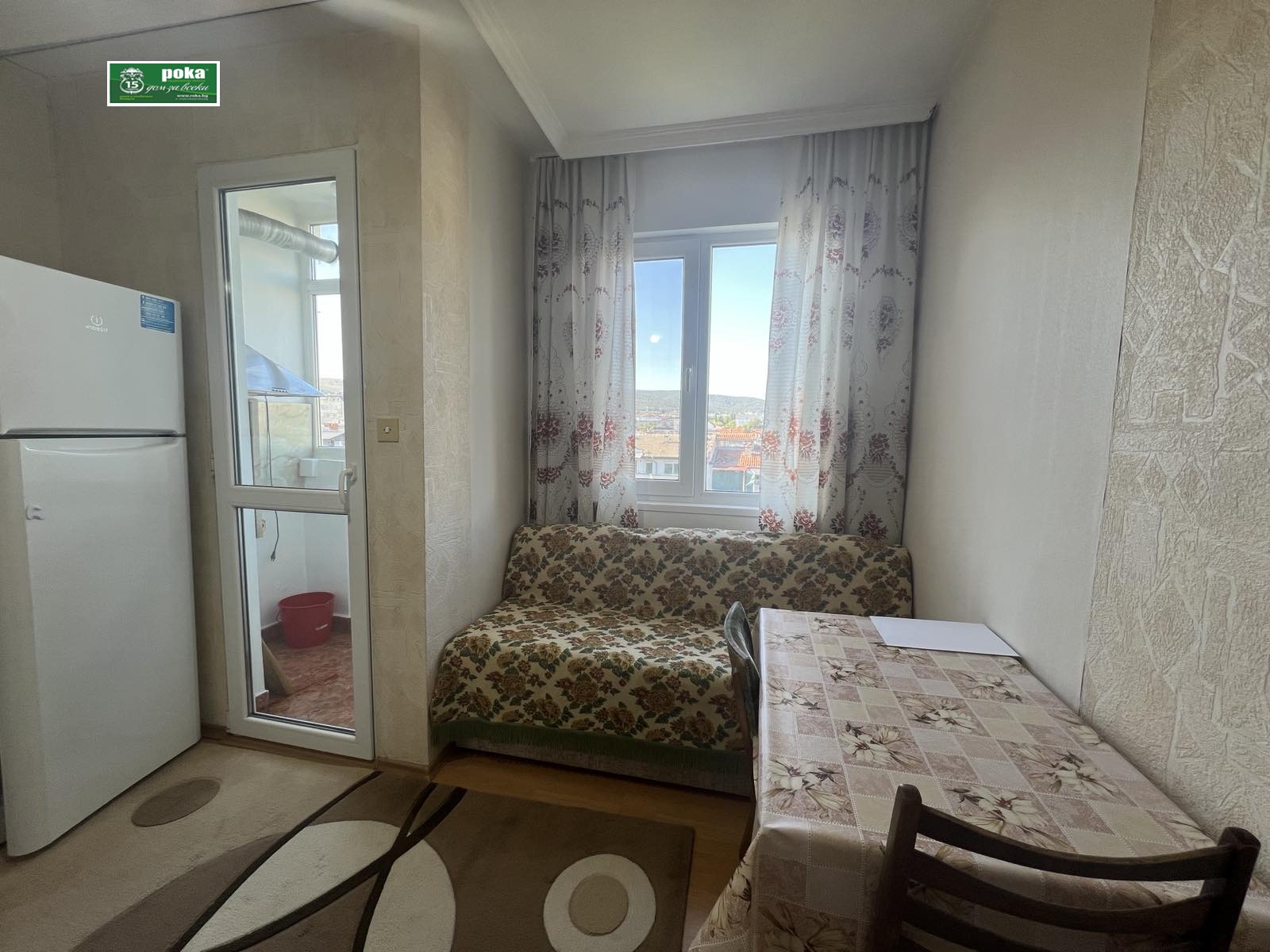 Рока имоти предлага обзаведен апартамент под наем в централна градска част. Състои се от една спалня, хол с излаз на тераса, отделна кухня с малка тераса, баня и тоалетна. Намира се на седми жилищен етаж в панелна сграда. Изложението е север- юг. Оборудването включва: климатик, хладилник, микровълнова печка. Допълнително ще бъдат добавени фурна и пералня.
