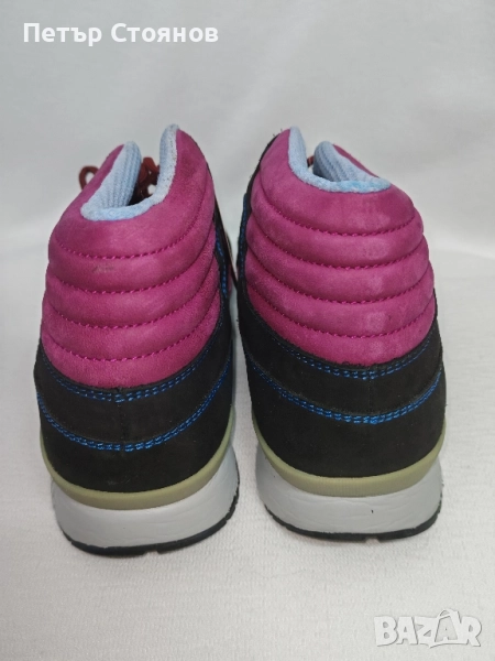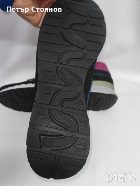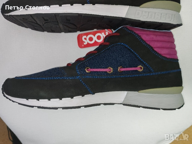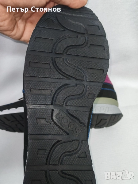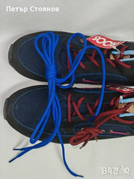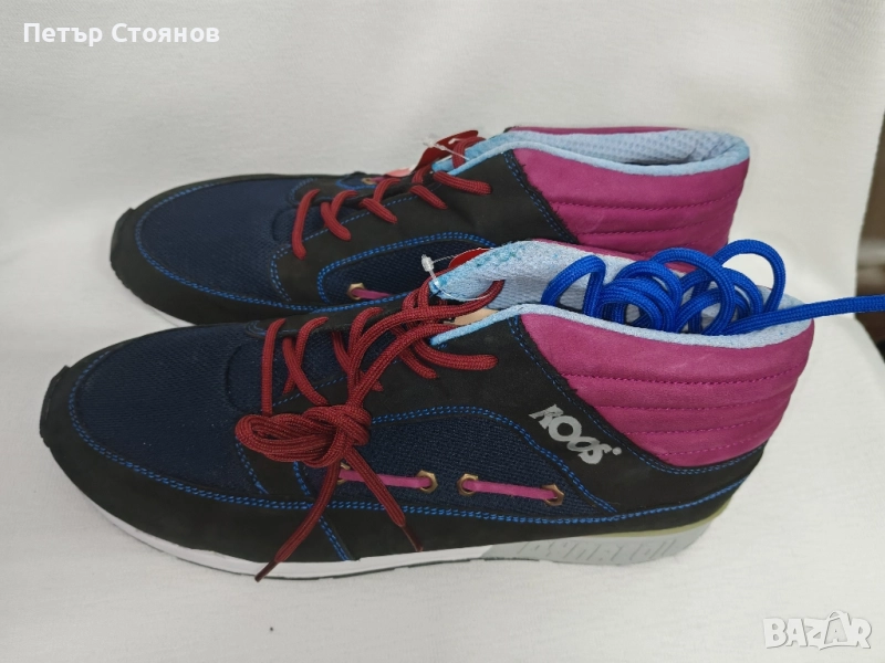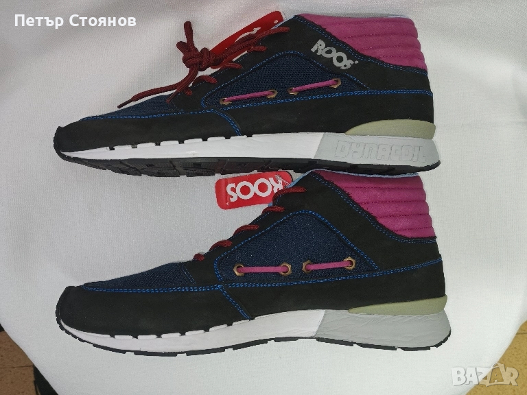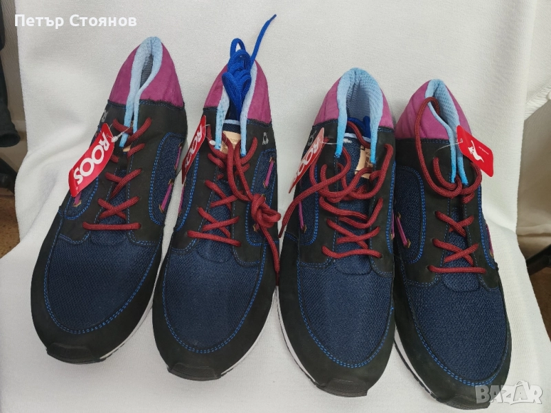 Предлагам два чифта мъжки спортни обувки на марката Kangaroos . обувките са купуени миналата година на разпродажба, като мости в магазин и за това са в пликове, а не в кутии. Изработени са в комбинация от черен естествен велур, тъмсонин текстил и пурпурен текстил около глезените. Хастарът и стелката са от текстил, а подметката от лек и удобен полиуретан. Имат по два комплекта връзки- бордо и сини.