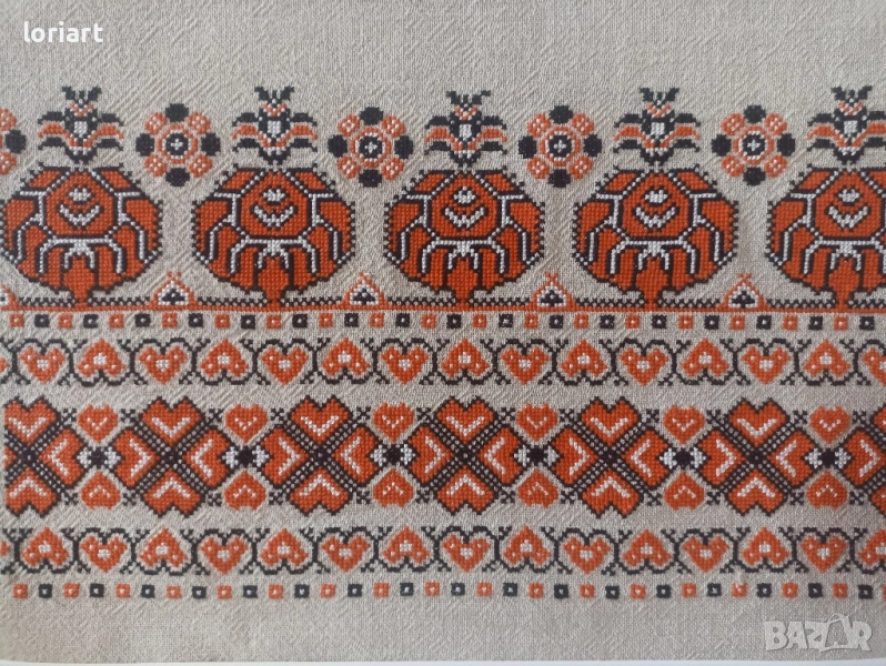 Рамкирана бродерия с кръст бод. Дизайна включва повтарящи се флорални мотиви в оранжево и черно и бордюри със сърца и геометрични мотиви.