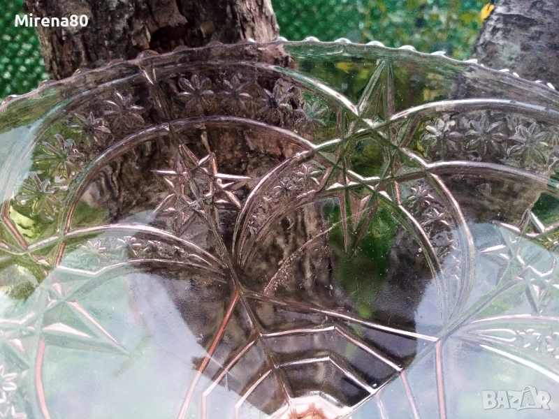 Стара българска фруктиера на столче от цветно стъкло. Производство - СИП Белослав. Голяма, масивно столче, богато гравирана. Диам. 25 см, вис. 20 см.Има малка фабрична неравност на едно място - на посл. снимка.