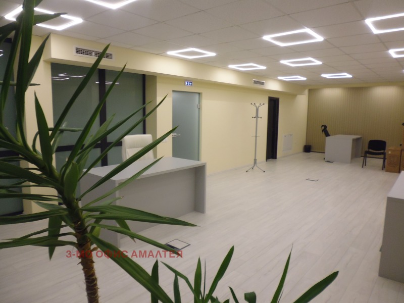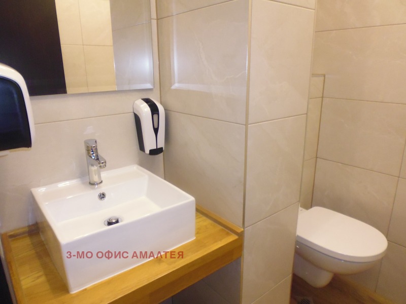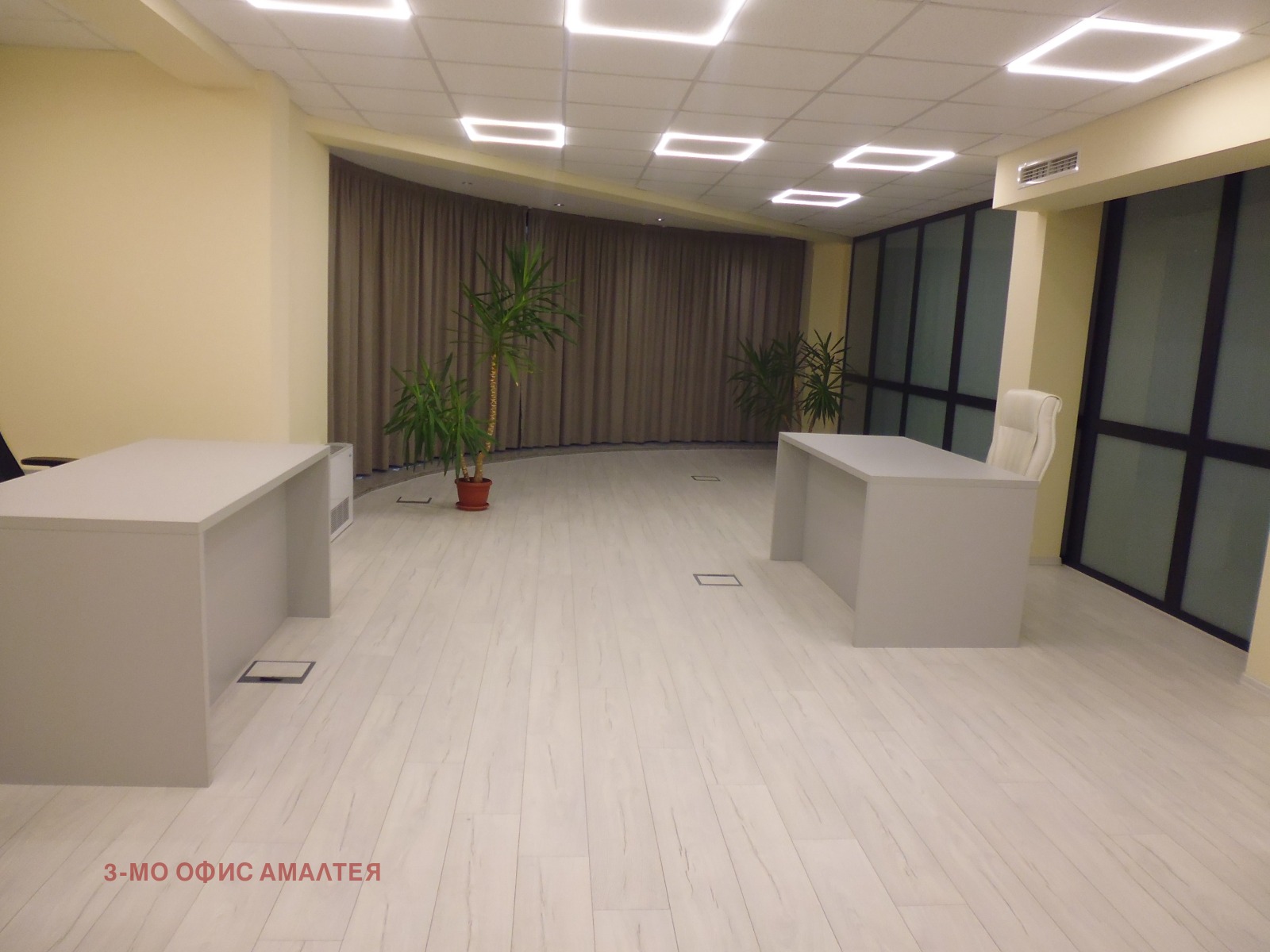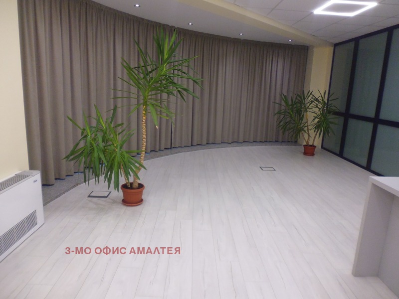 3mo Амалтея предлага на Вашето внимание под наем етаж с 3 бр. офиси, 2 бр. санитарни възли, коридор, кухненски бокс, сървър и тераса. Офисите се намират на първи етаж над партер в кокетна 4 етажна офис сграда в перфектно състояние и поддръжка. Разпределението на етажа е: просторен, светъл и слънчев офис със самостоятелен санитарен възел с площ от 132 кв.м. Втори офис също светъл, слънчев и просторен с площ от 50 кв.м. Заседателна зала, която може да се използва и като работна или с друго предназначение по преценка на наемателя с площ от 40 кв.м. Двоен санитарен възел за етажа 4 кв.м., кухненски бокс 4 кв.м., сървърно помещение 1,5 кв.м., коридор с излаз на обща тераса и работещ асансьор. Състоянието е: подови настилки, ламиниран паркет и естествен камък. Стените са с латекс и облицовка от естествен камък и минерална мазилка в коридора. Височината на таваните е 3.05 м. Офисите са с качествена алуминиева дограма 'Schuco', външна изолация, окачени тавани и окабеляване. Отоплението е решено чрез конвекторна инсталация за отопление и охлаждане. Сградата е обезопасена със самостоятелна ограда, СОТ и охрана. Намира се до спирки на различни видове наземен градски транспорт, на около две спирки от съществуваща станция на метрото и на метри от предстоящото изграждане на нова такава. Близо е до магазини от големи търговски вериги, училище, детски градини и площадки за отдих и спорт. На тихо място и на втора линия от възлови за квартала булеварди към центъра на София и лесен, и бърз изход от столицата. Върху наемната цена се начислява ДДС. За повече информация и огледи - на посочения телефон.