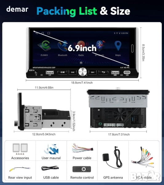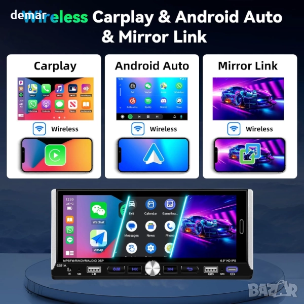 Това 6,9-инчово еднодиново Android 13 автомобилно радио предлага плавно и бързо изживяване с вграден WiFi, GPS навигация и Bluetooth свързаност. Поддържа както кабелни, така и безжични Apple CarPlay, Android Auto и Mirror Link за безпроблемна интеграция с телефон, разговори със свободни ръце и достъп до музикални или навигационни приложения. HD IPS сензорният екран осигурява ясна картина, докато FM/RDS радиото с 18 предварително зададени настройки и регулируеми настройки на еквалайзера подобрява аудио удоволствието. То също така поддържа вход за камера за задно виждане (камерата не е включена) за по-безопасно движение на заден ход и управление от волана за бързо и удобно управление по време на шофиране.