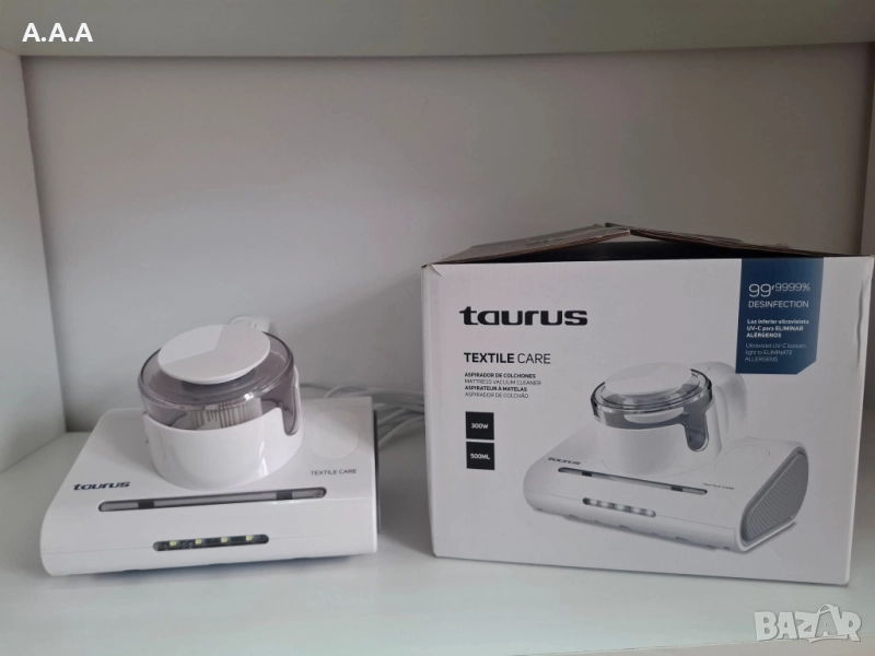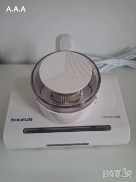 Прахосмукачката за матраци Textile Care от Taurus комбинира мощност 300 W, всмукателна сила 10 000 Pa и UV-C ултравиолетова светлина за елиминиране на бактерии, акари и алергени. Оборудвана с моторизирана силиконова четка и предна LED светлина, тя осигурява ефективно почистване дори в тъмни зони. Контейнерът за прах от 500 мл се изпразва лесно, а 4-метровият кабел осигурява удобство и обхват. Идеална за матраци, дивани и текстил, тя насърчава по-здравословен дом без алергени.