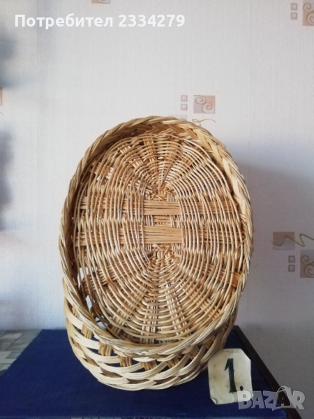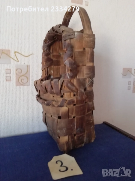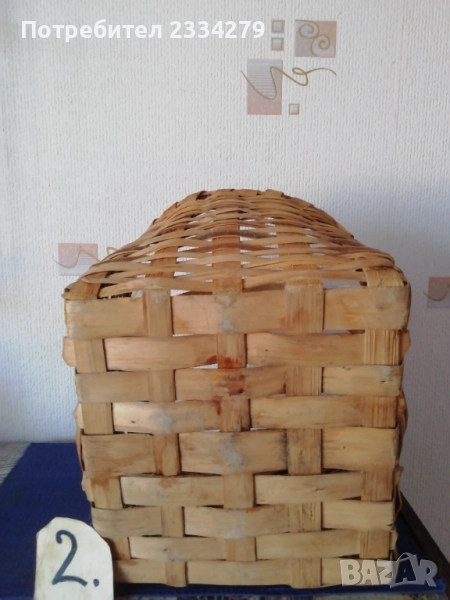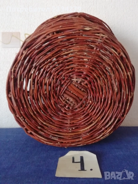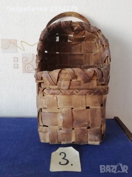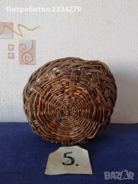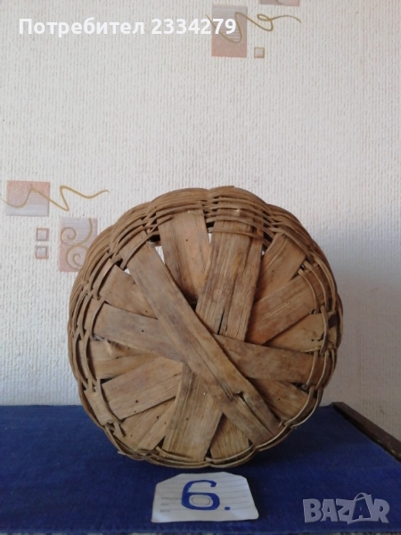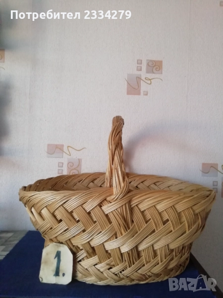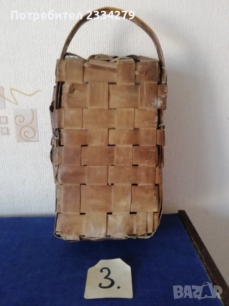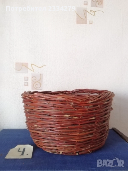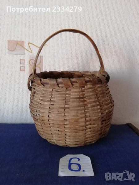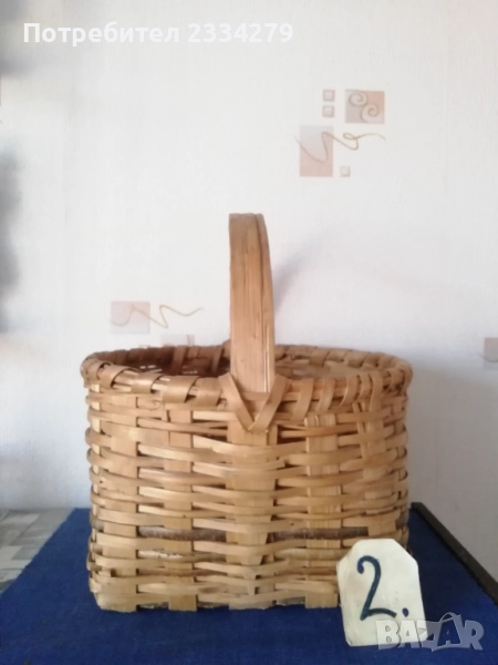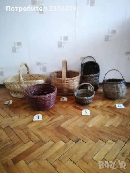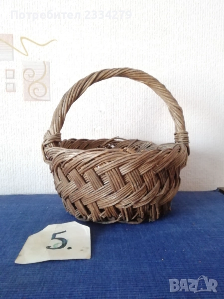 плетен кош с размери дължина 35х30см., дълбочина 23см. и другият е същият но с размери 40х35см.,дълбок 25см., цена за брой 17лв.; N:3 рядко срещан ръчно изплетен кош за яйца и дребни плодове 0т 30-те години, размери 35х20х17см., цена 25лв.; N:4 Стар кош изплетен ръчно от пръчки използван за яйца, плодове и зеленчуци, размери 31х19см., цена 10лв.; N:5 малко плетен кошче стара ръчна изработка с размери 23х11см., цена 10лв.; N:6 плетен кошче с размери 23х19см., цена 13лв. Всички могат да се ползват или за декорация на битова къща, двор, градина, заведение механа и други.