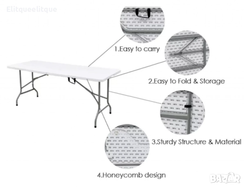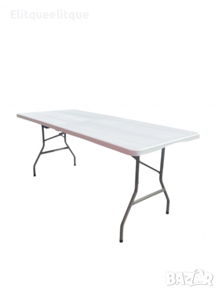Сгъваема маса; Голяма сгъваема маса - бял цвят, пластик + желязо Тази голяма сгъваема маса е идеалният избор за всяко пространство, предоставяйки комфорт и стил. Изработена от пластик и желязо, тя е лека, но същевременно устойчива и стабилна. В бял цвят, масата лесно се вписва във всякакъв интериор, като същевременно е лесна за почистване. Разполага със сгъваем механизъм, който я прави удобна за съхранение и транспортиране. Характеристики: Размери: 180 x 74 x 74 см; Материали: Пластик и желязо; Цвят: Бял; Сгъваем механизъм за лесно съхранение; Подходяща за използване в дома, офиса или на открито.