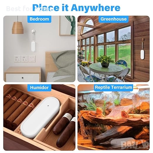 Дистанционно наблюдение и интелигентно свързване: можете лесно да наблюдавате този измервател на влажност и температура дистанционно чрез приложението Homgar. Ако промените средата, можете да настроите интелигентни преки пътища. Например, климатикът се включва автоматично, ако температурата в помещението надвиши 36°C, или овлажнителят се включва, когато влажността падне под 20% относителна влажност.