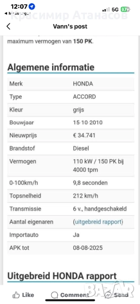 Honda Accord 2.2 I-DTEC, Седан 150кс. 2011г. На !!Части!! Хонда Акорд 2010г.