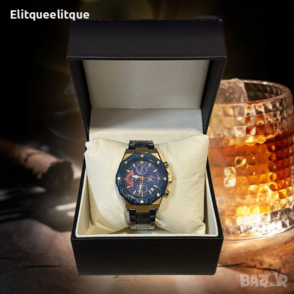 Водоустойчив часовник; Стоманена каишка Четирите стрелки работят Функции: Хронограф, дата дисплей; Материал на корпуса: Неръждаема стомана; Циферблат: Тъмносин с текстурирана повърхност; Водоустойчивост: Устойчив на пръски (не е предназначен за плуване); Гаранция: 12 месеца.
