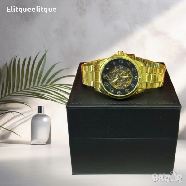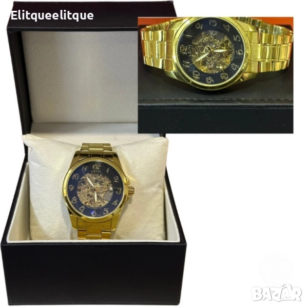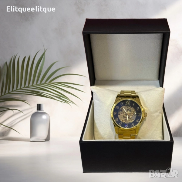 Марка: LEIYI; Механичен Материал на корпуса: Неръждаема стомана с позлата; Материал на каишката: Метална гривна; Стъкло: Закален минерален кристал; Циферблат: Черен с арабски цифри и открита механика; Водоустойчивост: Устойчив на пръски (не е подходящ за плуване); Гаранция: 12 месеца.