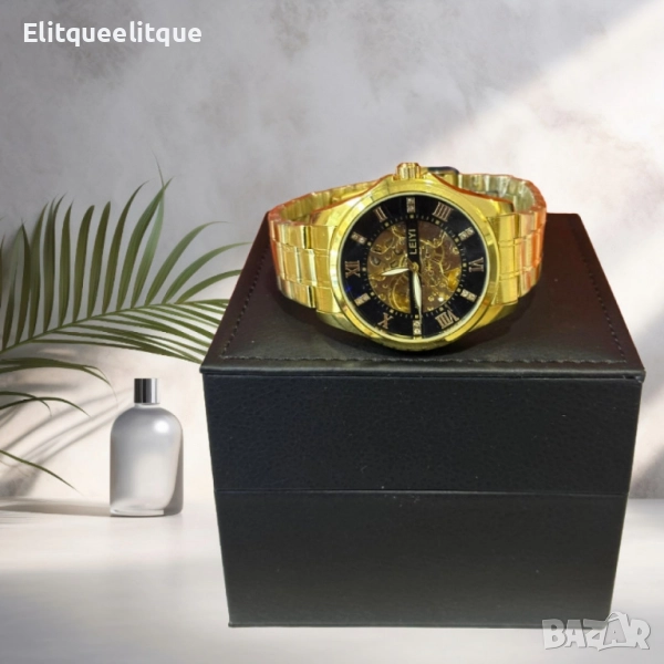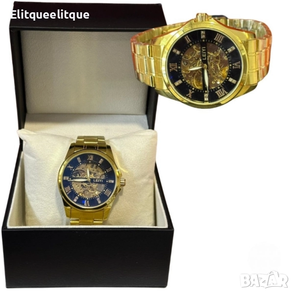 Механизъм: Механичен; Материал на корпуса: Неръждаема стомана със златно покритие; Циферблат: Скелетонен дизайн със син или черен фон; Каишка: Метална верижка в златист цвят; Водоустойчивост: Устойчив на пръски (не се препоръчва потапяне); Стъкло: Закалено минерално стъкло; Гаранция: 12 месеца.