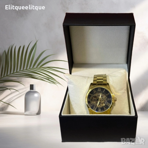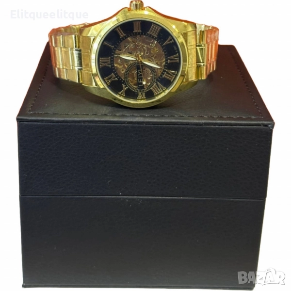 Механизъм: Механичен; Материал на корпуса: Неръждаема стомана със златисто покритие; Циферблат: Тъмен фон с открит механизъм и римски цифри; Каишка: Метална верижка с регулируема дължина; Стъкло: Устойчиво на надраскване; Водоустойчивост: Устойчив на пръски; Гаранция: 12 месеца.
