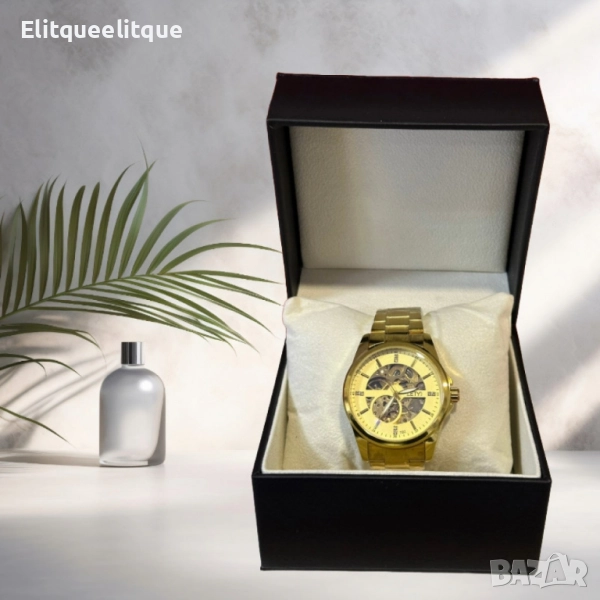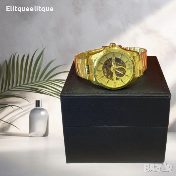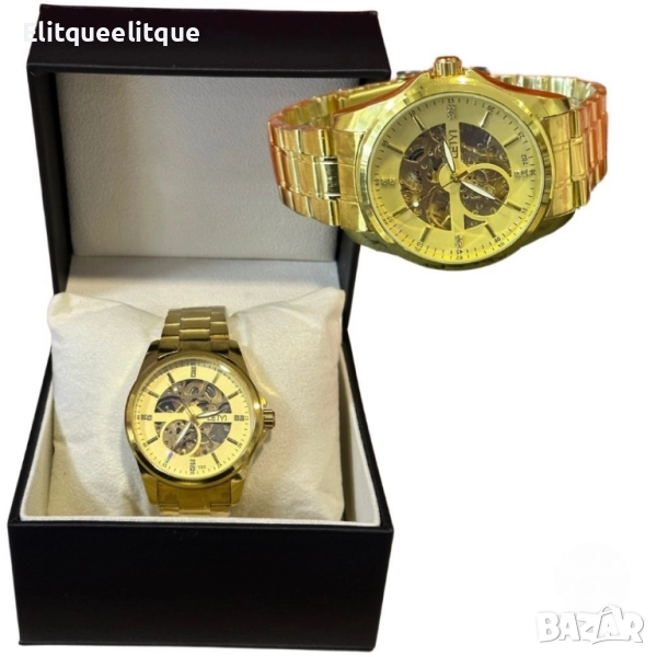 Механизъм: Механичен; Материал на корпуса: Неръждаема стомана със златно покритие; Циферблат: Полупрозрачен с допълнителни индикатори; Верижка: Метална, златна, регулируема; Водоустойчивост: Подходящ за ежедневна употреба (не се препоръчва за плуване); Стил: Луксозен, класически; Гаранция: 12 месеца.