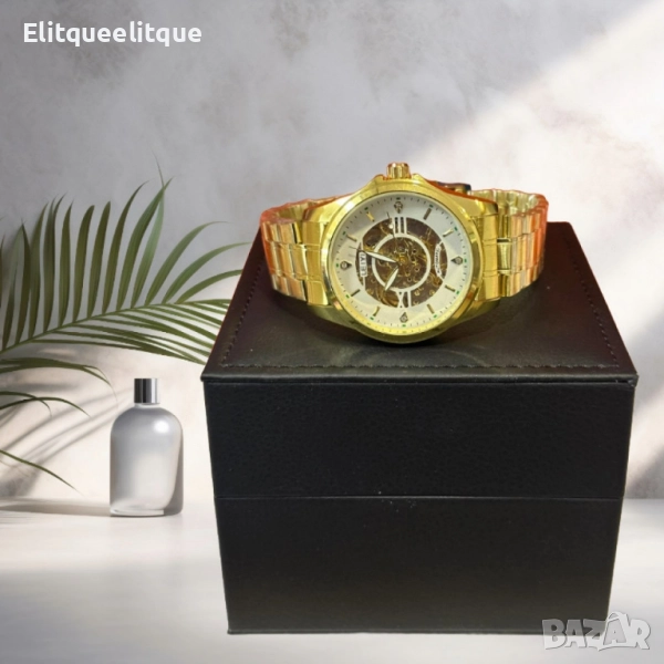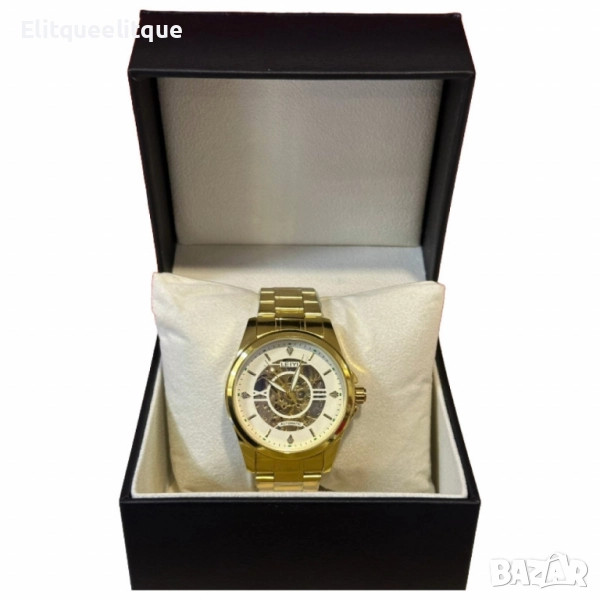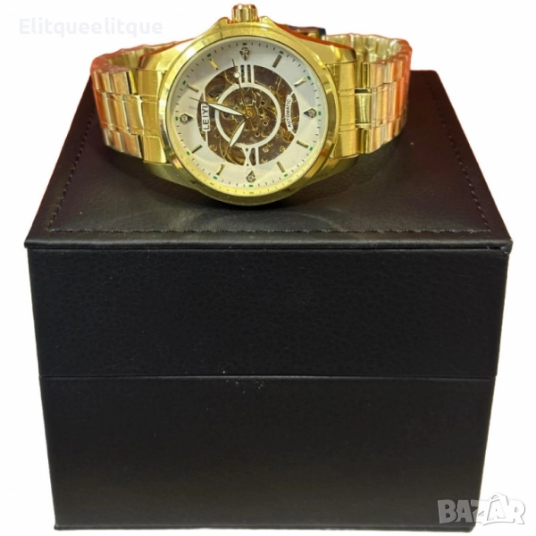 Механизъм: Механичен; Материал на корпуса: Неръждаема стомана със златно покритие; Циферблат: Бял с открит механизъм и кристални акценти; Верижка: Златиста метална, регулируема; Водоустойчивост: Подходящ за ежедневна употреба (не за гмуркане); Стил: Луксозен, класически; Гаранция: 12 месеца.