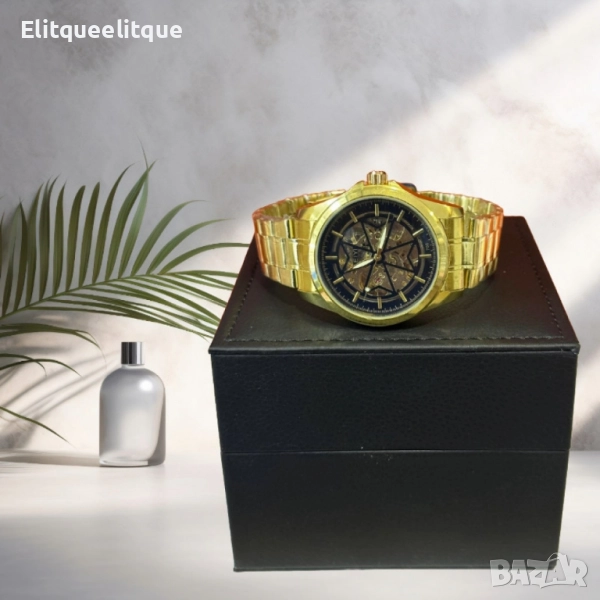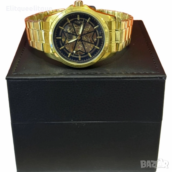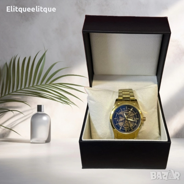Механизъм: Механичен; Корпус: Неръждаема стомана със златисто покритие; Циферблат: Син скелетон с видима механика; Каишка: Метална верижка с регулируем размер; Водоустойчивост: Устойчив на пръски и влага; Стъкло: Минерално, устойчиво на надрасквания; Гаранция: 12 месеца.