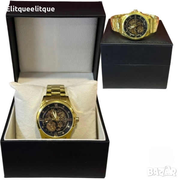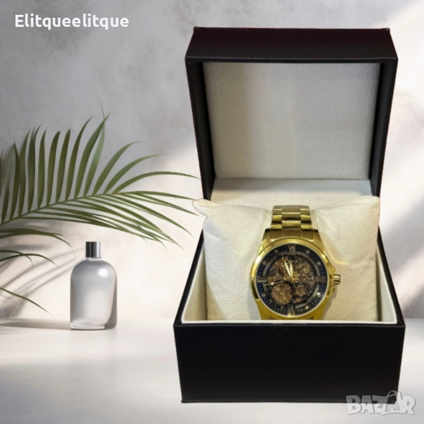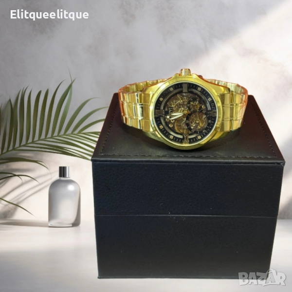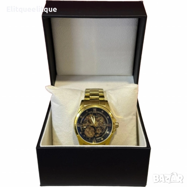 Механизъм: Механичен; Материал на корпуса: Неръждаема стомана със златисто покритие; Циферблат: Скелетен дизайн с видими зъбни колела; Каишка: Регулируема метална верижка; Индикатори: Римски цифри и декоративни кристали; Устойчивост: Устойчиво на надраскване стъкло; Гаранция: 12 месеца.