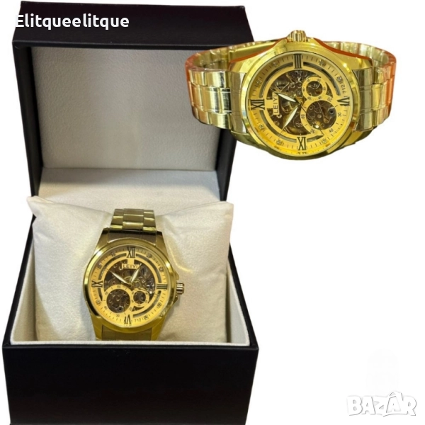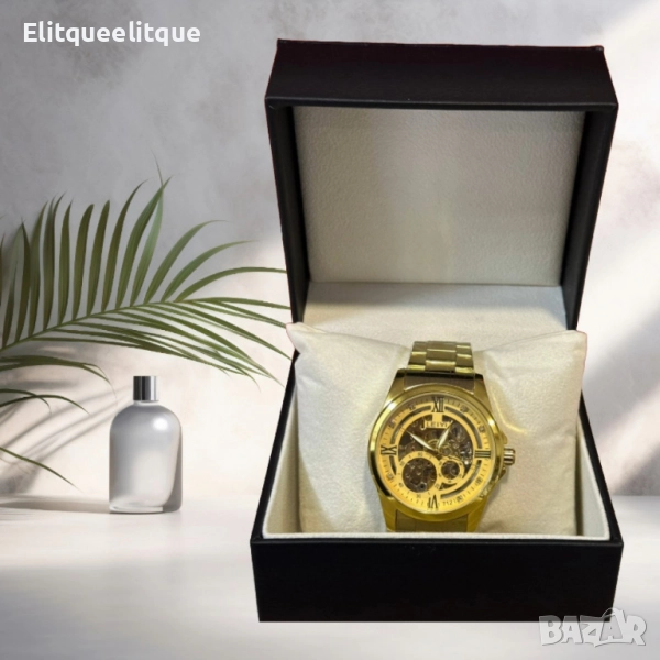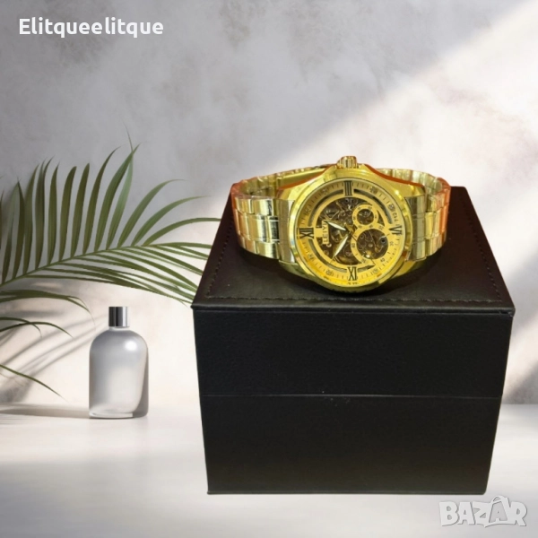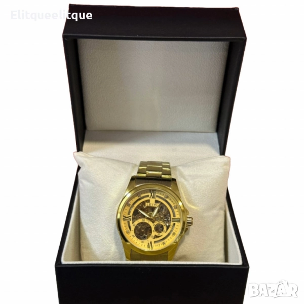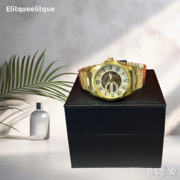 Механизъм: Механичен; Материал на корпуса: Неръждаема стомана със златисто покритие; Циферблат: Отворен дизайн с римски цифри и кристални инкрустации; Каишка: Метална верижка с регулируем размер; Стъкло: Устойчиво на надраскване; Водоустойчивост: Устойчив на пръски; Гаранция: 12 месеца.