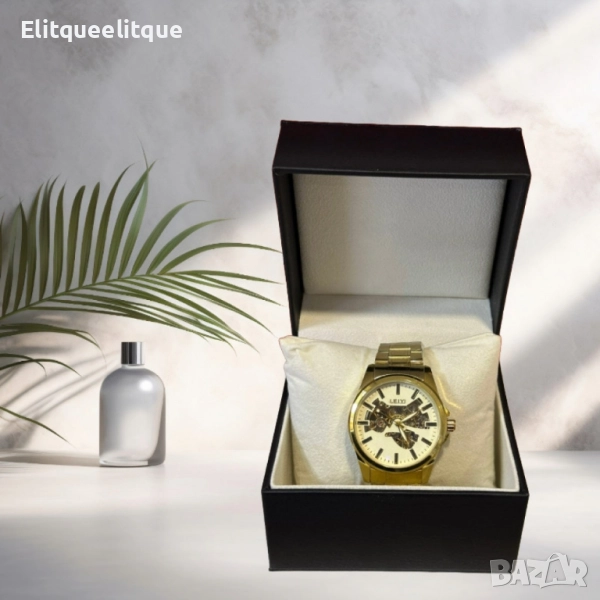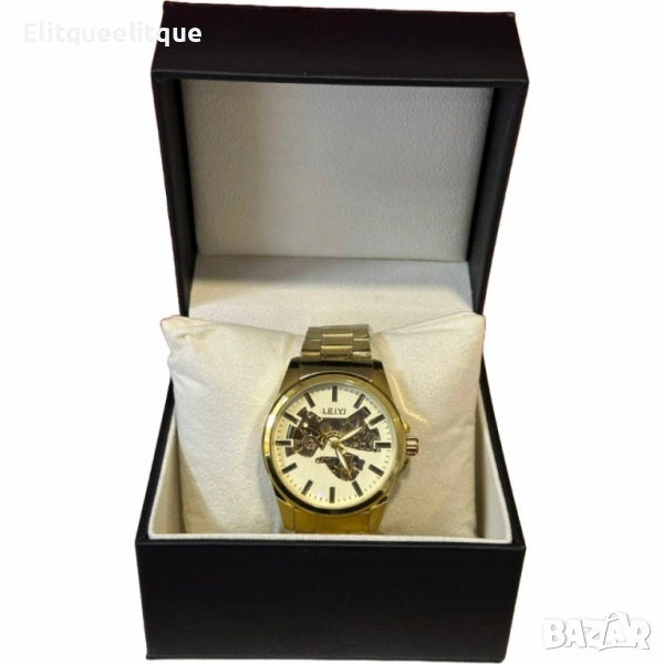 Марка: LEIYI; Механизъм: Механичен; Материал на корпуса: Неръждаема стомана (златисто покритие); Материал на стъклото: Закалено минерално стъкло; Водоустойчивост: Да (устойчив на пръски); Диаметър на корпуса: 44 мм; Дължина на верижката: Регулируема; Гаранция: 12 месеца.