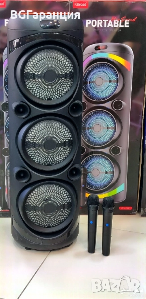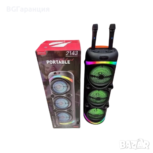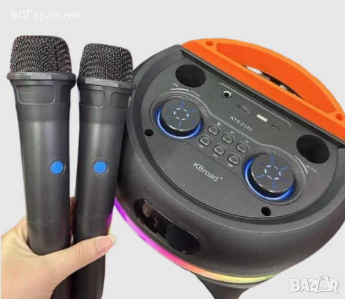 Портативна караоке озвучителна система с три мощни говорителя и два безжични микрофона – идеално решение за домашни партита, събития, озвучаване на открито или професионални изяви. Системата е създадена да осигури силен и чист звук, комбиниран със стилен дизайн и лесна преносимост.